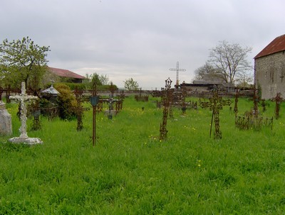 Croix de fer, auprès d’une curieuse chapelle du 11ème siècle dans le cimetière, les vieilles croix rouillées, tordues, cassées, se cachent parmi les herbes hautes et meurent en silence